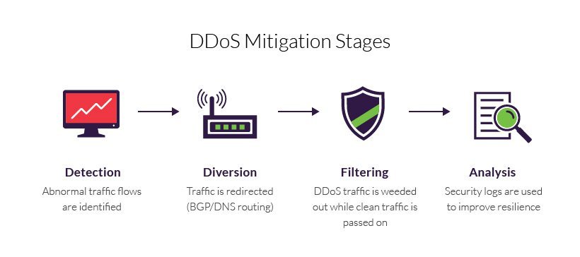 - Diversion – Traffic is rerouted away from its target, either to be filtered or completely discarded.